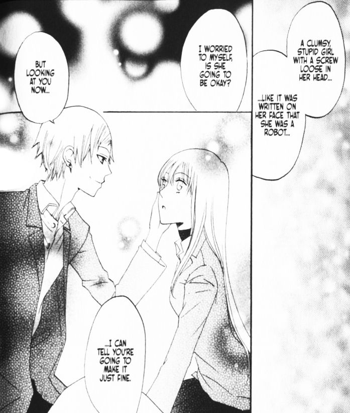 After a satisfying conclusion to the series Karakuri Odette—a quirky comedy manga about a robot who starts going to school and trying to learn about humanity—I began reading the manga-ka’s comments. One stuck out to me in particular: “My favorite guy character was Yukimura [a first year that has a crush on Odette], so I was excited about getting him together with Odette. But he wasn’t very popular with the readers, so I decided to give up on that idea. And ever since I’ve been afraid to give my lead character any kind of male love interest as another main character.” I was a bit thrown off, forget Yukimura, there was a romance in the series that played out great! Did she not write the manga I just finished reading? Did she completely forget about Odette’s interactions with Asao? Maybe it is one of those humble statements, but really she is selling her love piece of the story short.