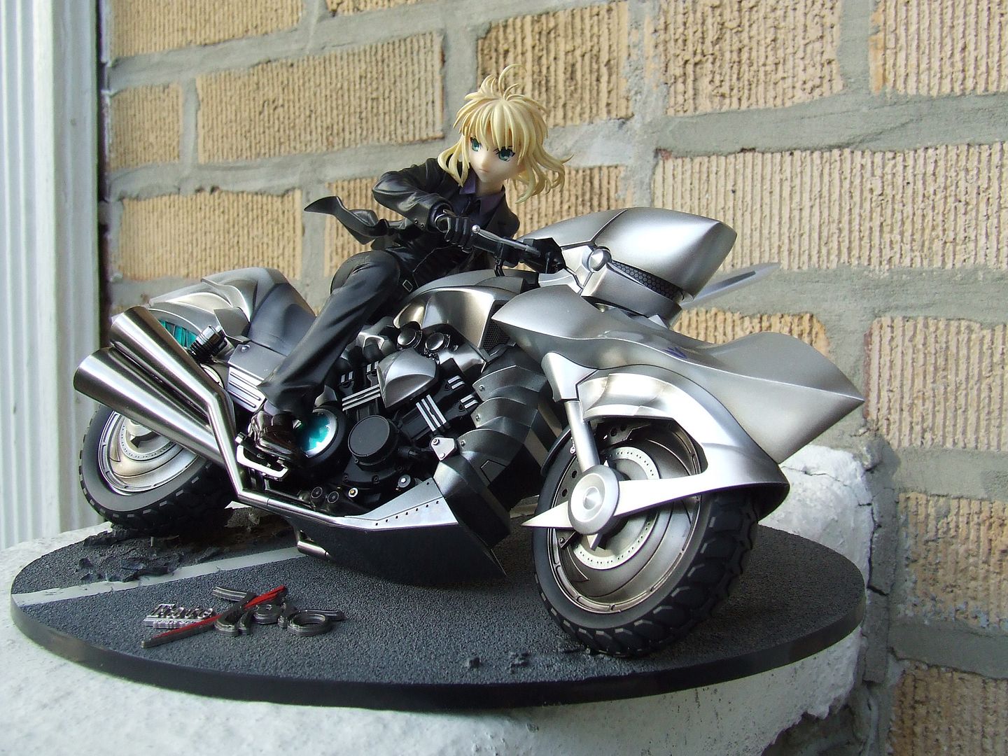 This is figure is based on scenes from the 21st episode of Fate/Zero ,”Knight on Two Wheels”. During the course of the series Irisviel gives Saber her Yamaha V-Max motorcycle as she has become to sickly to ride it. Since Saber has an A Rank ride skill with Kiritsugu as her master she is easily able to ride vehicles like motorcycles at a skill level slightly beyond that of a normal human intuitively. She is not as good as someone of the Rider class in the same situation but is still supernaturally skilled none the less.