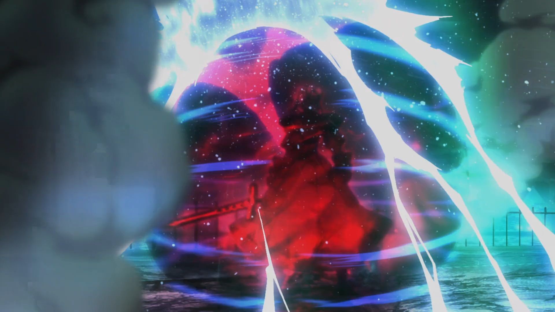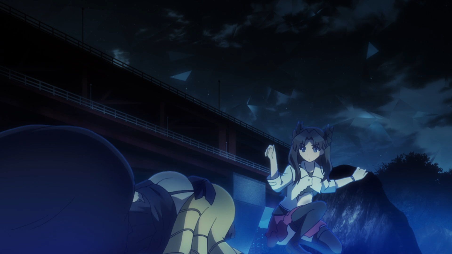 But in all seriousness the episode begins with a recap of the last episode where in the aftermath of the battle with Caster we see Rin and Luvia discussing the fact that the closed space around them is not collapsing making them realize a bit too late that a second servant is in the area. And then the Saber card beats them down.