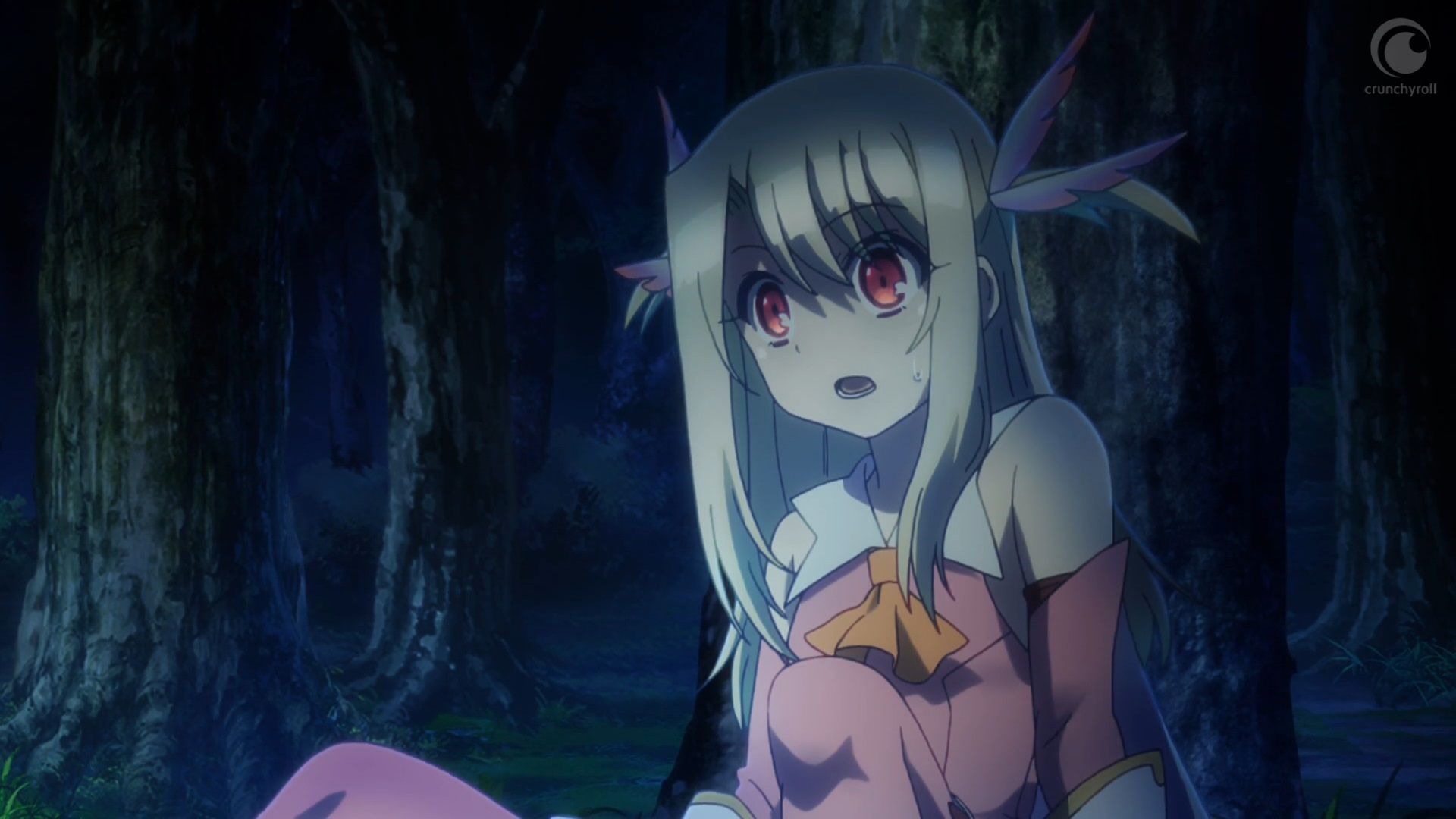 The bungled rescue attempt leads to Ilya getting a major but not life threatening gash from a long-range blast that barely missed from connecting. This leads Illya to go into a state of shock. In many ways despite everything that has happened this is the first time she has realized she very well may die doing this. When she was almost nuked by Caster the threat was almost abstract. This danger has a real face and a clear and manifest hurt. A reaction like this is probably why Miyu wanted Ilya not to fight in the first place.