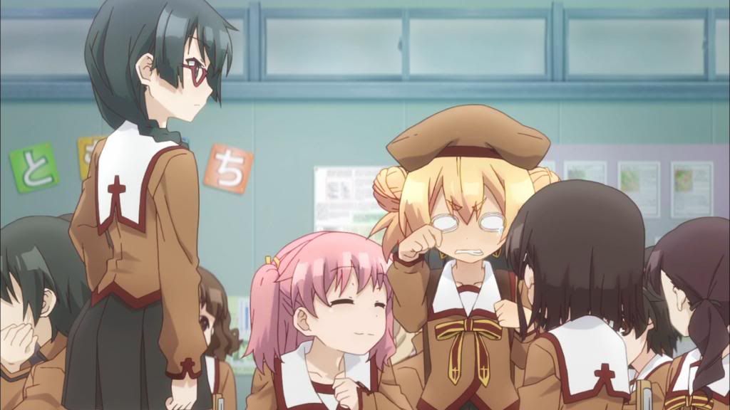 When Illya gets to school she encounters the elephant in the room about last night. Illya refuses to talk to Miyu and Miyu refuses to say anything as well. So they basically give off an unbearable level of tension between the two of them. The socially conscious of the group know to avoid treading in the emotional minefield but Tatsuko Gakumazawa rushes in like there was free ice cream in the middle of the two girls who are upset. And like most people running wildly through a battlefield she gets blown up for her rashness and lack of observational skills.
