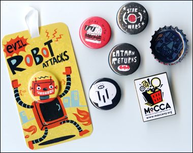 And the creation of bottlecap buttons featuring geometric imaginings, the one I picked up was a robot naturally, came from SVA but sadly I do not know the artist.