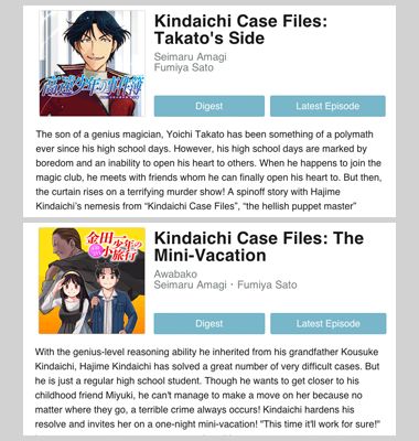 This means that you can always read the first few chapters of a series but past that there is no way to read any of the expired middle chapters. When we wrote this review the first three and last five chapters of Kindaichi Case Files: Takato’s Side were available but there was no way to read the 8 chapters in between. So I could have skipped to the end but I would have missed everything else. As it stands that is less than ideal but if you read this article 6 months from now you won’t even be able to skip to the end and get some conclusion. If this was just a commercial for the print releases that would be fine but as it stands they really need to start giving you some method to see the older chapters by either letting you buy old chapters or selling a subscription that lets you read their back content. That is not that important with something episodic like Spoof on Titan but it could be hard to keep an audience with any title that has story arcs until there is some solution in place.