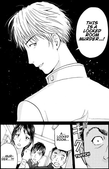 The first chapter is kind of amazingly boring. It mostly consists of Takato meeting and joining the magic club at his school. Then we finally get a death in the last three pages. I know it sounds awful, but that I what I was wanting and waiting for. The introduction of the group felt stilted, like it was just going through the motions before leading up to the important thing: the murder. At least the mystery itself has not only a locked room hook but also a gruesome execution that makes you very curious about how it was pulled off.
