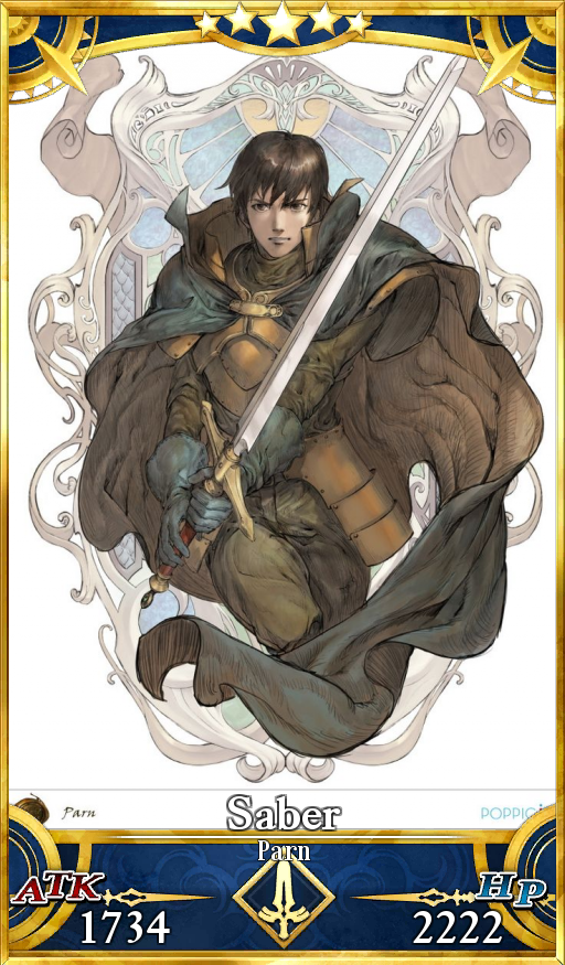 In many way Parn is the quintessential young swordsman. I see him as a powered up version of Le Chevalier d’Eon. He is going to duel characters one on one so he can draw the enemy to him with a taunt. At the same time he we have a Noble Phantasm that does a great deal of damage to one opponent as opposed to a good deal of damage to everyone. Other than that he is a standard Saber just like he is the prototypical shonen hero.