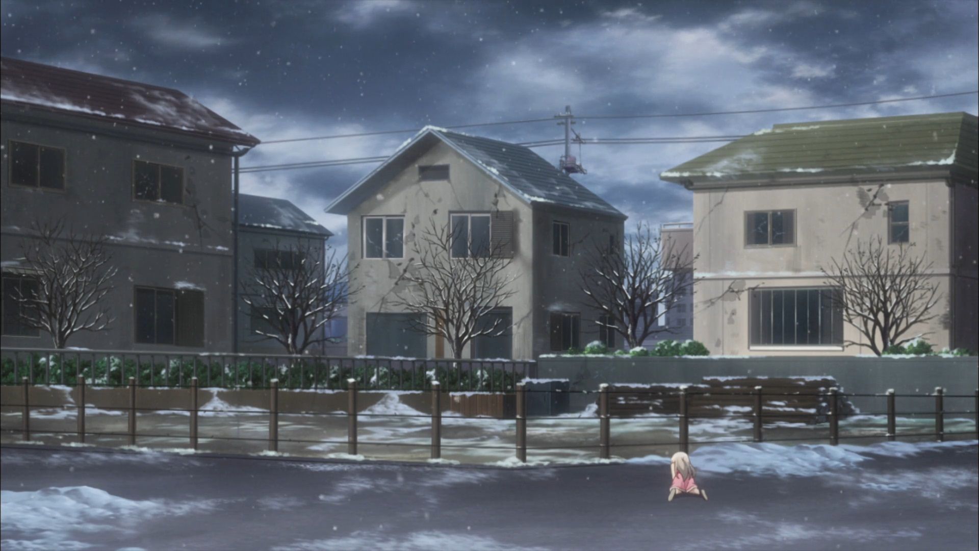 The episode begins in medias res with Illya regaining consciousness in a snowy field. She clearly has been separated from everyone else but is most concerned about Miyu. The empty town that seems to be within the end phase of Ragnarök would normally be bleak but for Ilya, it has an extra level of significance and an added amount of pathos. The wintry plains of Einzbern Castle are always a symbol of loss, separation, and bitterness for Illya in any iteration of the Fate franchise. So the world with that theme as its essence is quite possibly the worst possible world for her .