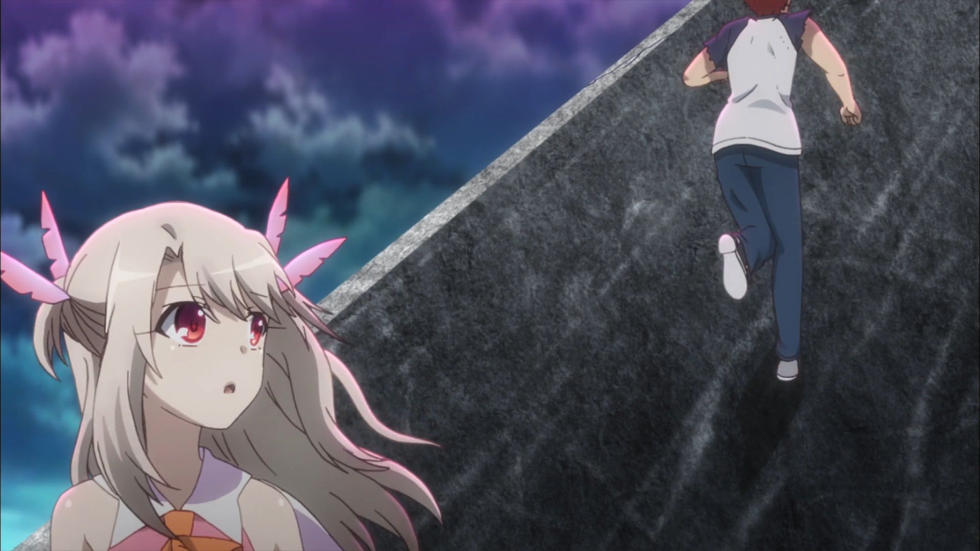 At first, Illya is prepared for a brother and sister reunion until a big nasty reality slaps her in the face. This version of Shiro is Miyu’s big brother and not her’s therefore, he runs past her like a stranger. The reality that she is a stranger in this world could not be clearer than at this moment. This is Miyu’s world. A universe where she probably has never even existed.