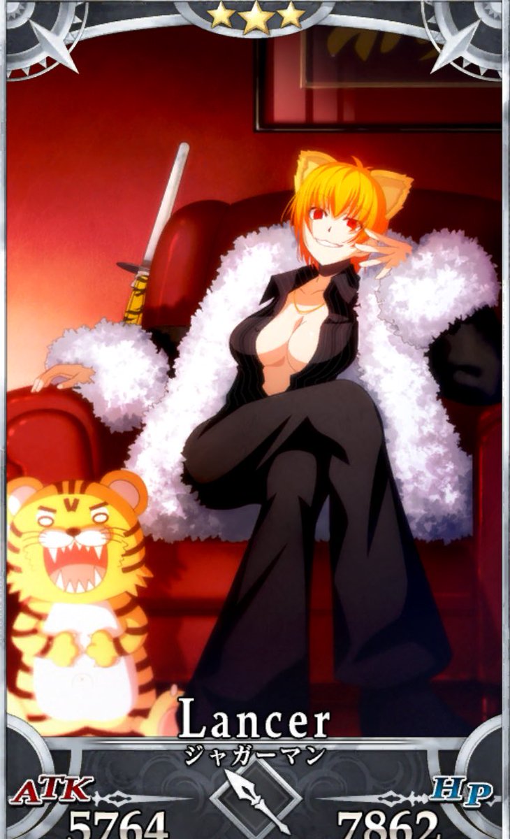 When we got home we discovered the amazing truth. After more people had obtained Jaguar Man they ascended her to her max level. Then her true nature was revealed. It was like Type-Moon was spying on our conversation and decided that a Mobster Tiaga was the best idea ever.