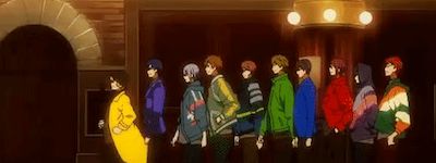 Free! S3 Dive to the Future ED: “GOLD EVOLUTION” by STYLE FIVE Colorful outfits, a Westside Story-like moment on the streets, then a costume change to tuxes, and dancing. We all need a full dance version of this ending.